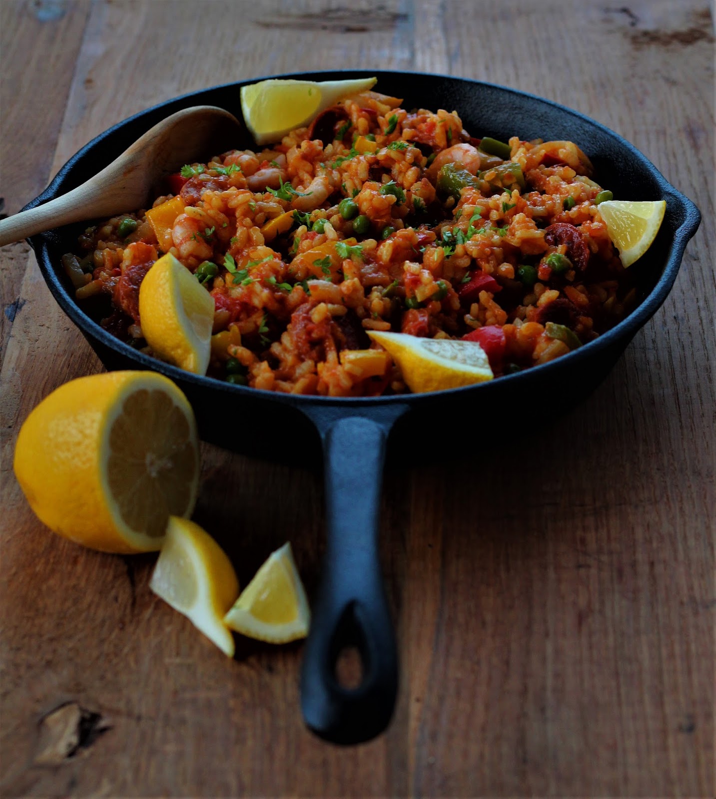 Jeg er blevet lagt ned af ondt i halsen, hovedpine og en let lille feber. Før det gik så galt, lavede jeg forleden denne dejlige spanske paella til min familie. Jeg kalder det en hverdags-paella, fordi der kun er nemme-at-få-fat-i ingredienser i, og så er den ret hurtigt lavet. Oveni kan man sagtens lave en tonse-stor portion, så der er til to dage. Den kan nemlig nemt varmes op i ovnen på anden-dagen.