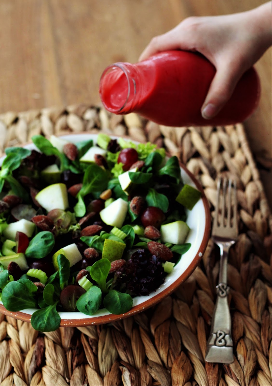 Waldorf-inspireret salat med hindbær-dressing (4 pers. som tilbehør)